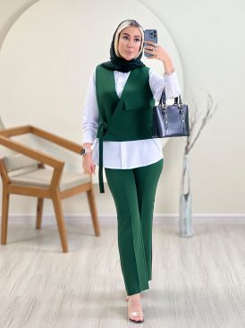 سه تیکه شامل مانتو پیراهنی , ژیله و کمربند می باشد.
